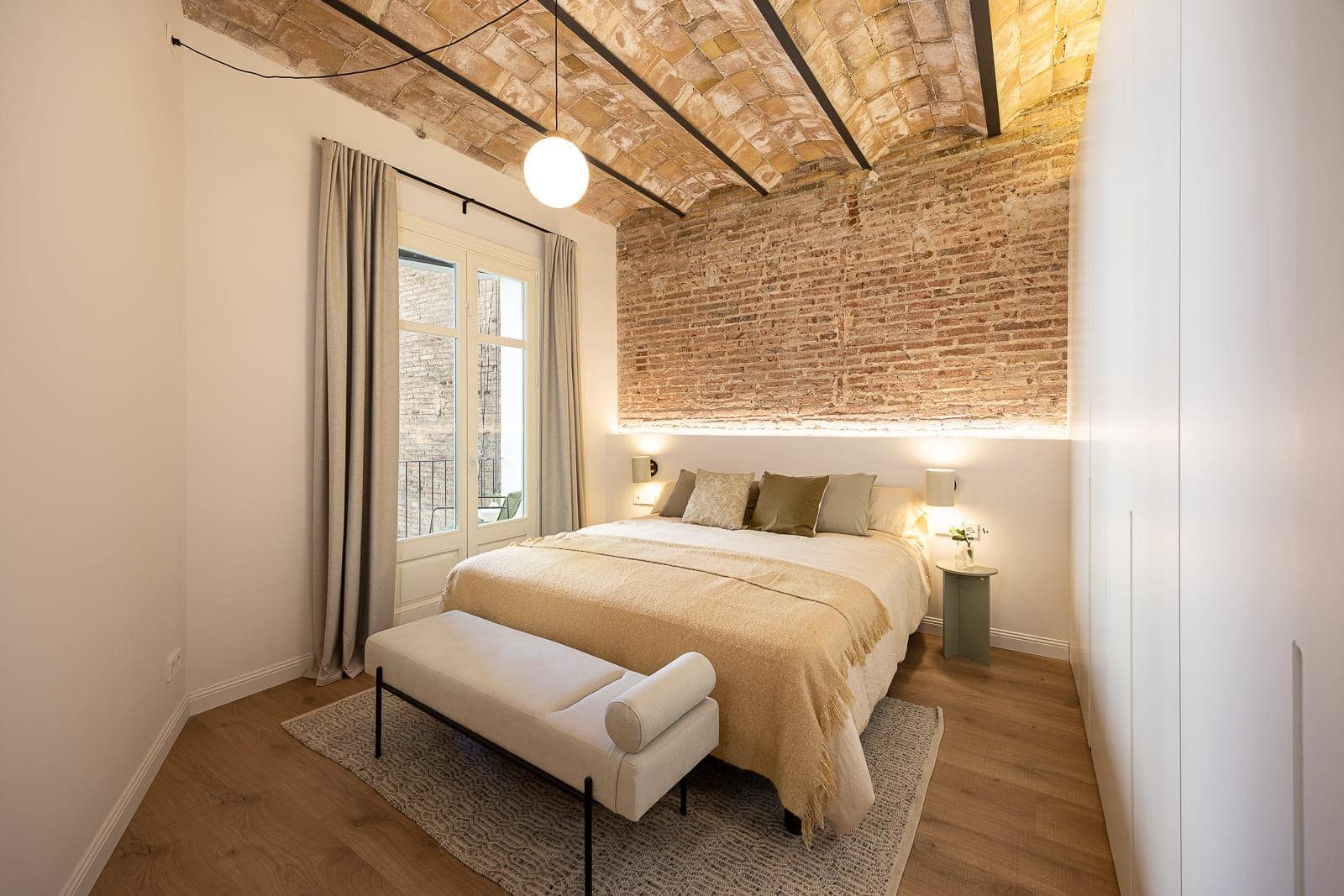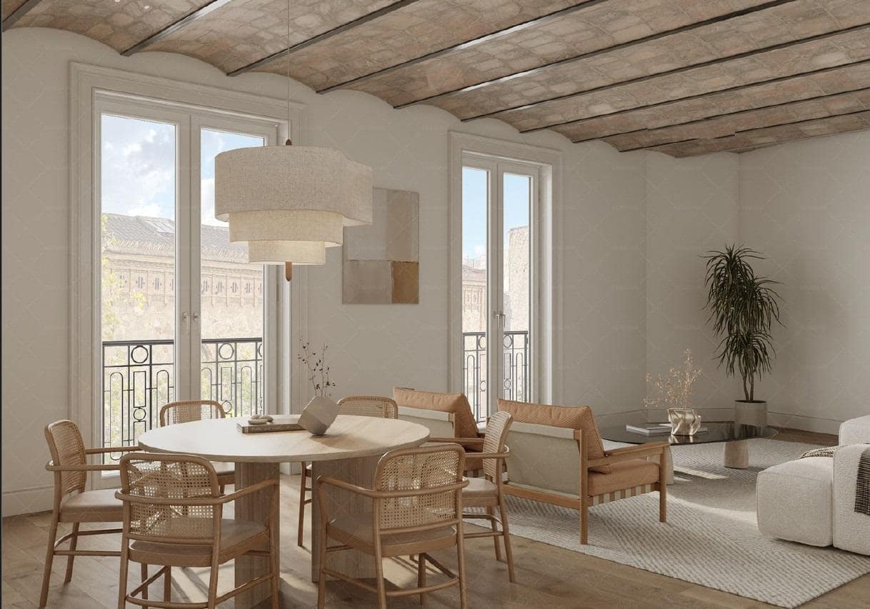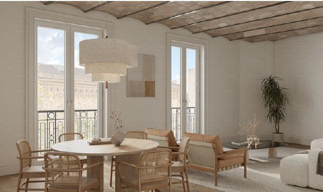 Descubre este maravilloso piso de 137 m² construidos, situado en una elegante finca regia de 1936 con ascensor, en la calle Roger de Flor, a pocos pasos del emblemático Passeig de Sant Joan, uno de los bulevares más apreciados de Barcelona.~~La propiedad ha sido reformada íntegramente con un gusto exquisito, empleando materiales y acabados de la más alta calidad, lo que la convierte en una pieza única dentro de la zona. Se trata de un segundo piso (tercero real), lleno de luz natural y con espacios amplios que ofrecen un hogar acogedor, funcional y elegante, ideal para quienes buscan exclusividad en una ubicación privilegiada.~~El corazón de la vivienda es un generoso salón-comedor, donde se han recuperado la volta catalana y una pared de ladrillo visto, que aportan carácter y personalidad. La estancia recibe abundante luz gracias a los dos balcones exteriores que la inundan de sol y vistas abiertas.~~La cocina, con elegantes puertas de hierro y cristal, permite integrarse o independizarse del salón según la ocasión, logrando un equilibrio perfecto entre amplitud y privacidad. Está completamente equipada con electrodomésticos Miele y se complementa con una amplia zona de lavadero independiente y un aseo de cortesía.~~La zona de noche cuenta con 2 dormitorios dobles en suite, ambos con salida al exterior: uno con balcón y otro con una acogedora galería. En ambos se han recuperado muros de ladrillo visto que funcionan como originales cabeceros. Una de las suites dispone de vestidor y la otra de un armario a medida de gran capacidad.~~Las carpinterías, tanto interiores como exteriores, han sido cuidadosamente restauradas y diseñadas. Las exteriores conservan los diseños originales, incorporando cristales bajo-emisivos y cámaras aislantes que aportan confort térmico y acústico. Las interiores, en madera natural, incluyen puertas abatibles o correderas Krona, armarios y mobiliario de baño hechos a medida con acabados de primera calidad e iluminación LED.~~El diseño se completa con techos ornamentados o en volta catalana con vigas de madera y hierro, paredes con molduras o acabados decorativos coordinados y suelos de parquet y baldosas hidráulicas, creando un conjunto armonioso y sofisticado.~~El entorno ofrece una calidad de vida inmejorable, con comercios de proximidad, centros educativos, servicios de salud, una variada oferta gastronómica y excelente comunicación mediante transporte público.~
