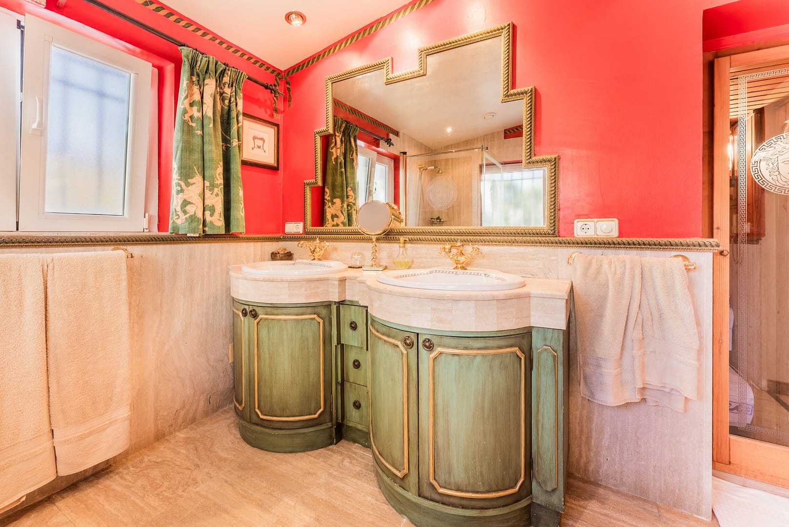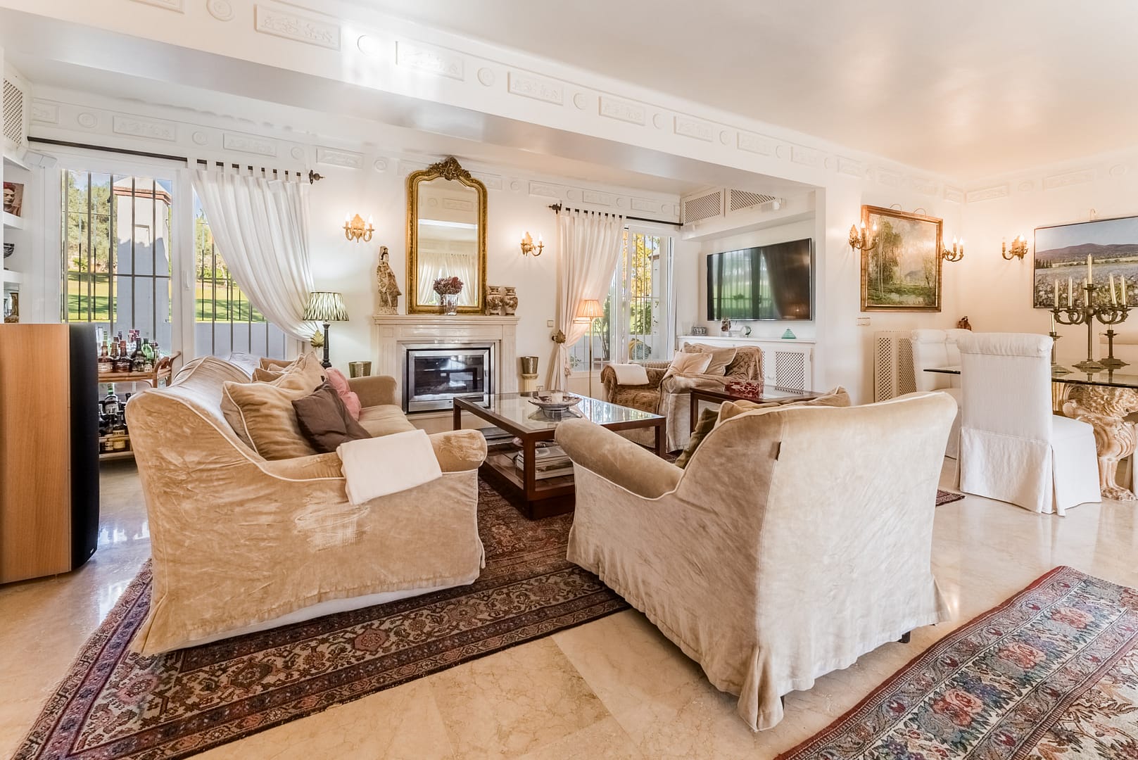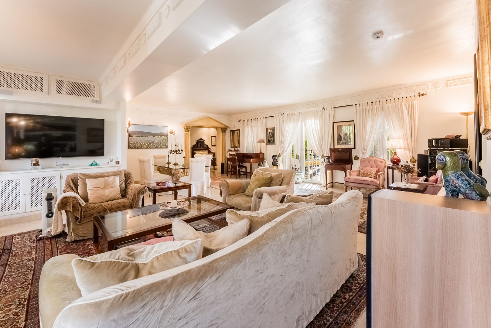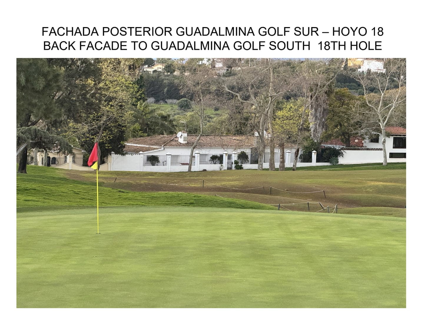 Maravillosa villa situada en primera línea del prestigioso campo de golf de Guadalmina Sur, directamente en el hoyo 18. Esta propiedad única combina privacidad, lujo y ubicación privilegiada en un área donde residen personalidades distinguidas, incluyendo un ex presidente de España. Situado en un tranquilo y seguro callejón sin salida, la propiedad se encuentra en una parcela de 801 m2 y tiene 686 m2 construidos (incluyendo terrazas) en una sola planta, diseñado con materiales de alta gama como travertino ibérico y macael blanco. Distribución y espacios La casa ofrece un amplio salón-comedor de más de 90 m2, tres dormitorios en suite, cocina totalmente equipada, zona de lavandería y sauna cubierta para cinco personas. Cada habitación ha sido diseñada para ofrecer comodidad, ligereza y elegancia, con acabados de primera calidad. Espacios exteriores y de ocio Disfrute de más de 300 m2 de terrazas y porches, ideal para disfrutar del clima mediterráneo y vistas al golf. El jardín tiene una piscina de agua fresca de 10 x 5 metros, perfectamente integrada en el ambiente natural. Equipo y seguridad La villa tiene un garaje cerrado y espacio para 4 vehículos adicionales, sistema de alarma con sensores de presencia, videoportador, puertas automáticas, riego automático de aspersión, calefacción por gasoil, carpintería Climalit con mosquiteros y barras de seguridad, así como un grupo de presión con un tanque de agua potable de 1500 litros y un tanque de gasoil de 1000 litros. Aspectos destacados Parcela: 801 m2 Superficie construida: 286 m2 habitable Terrazas: 400 m2 3 dormitorios, 3 baños, sauna, garaje cerrado Gran salón de 90 m2 Piscina privada y vistas panorámicas del campo de golf Guadalmina Sur