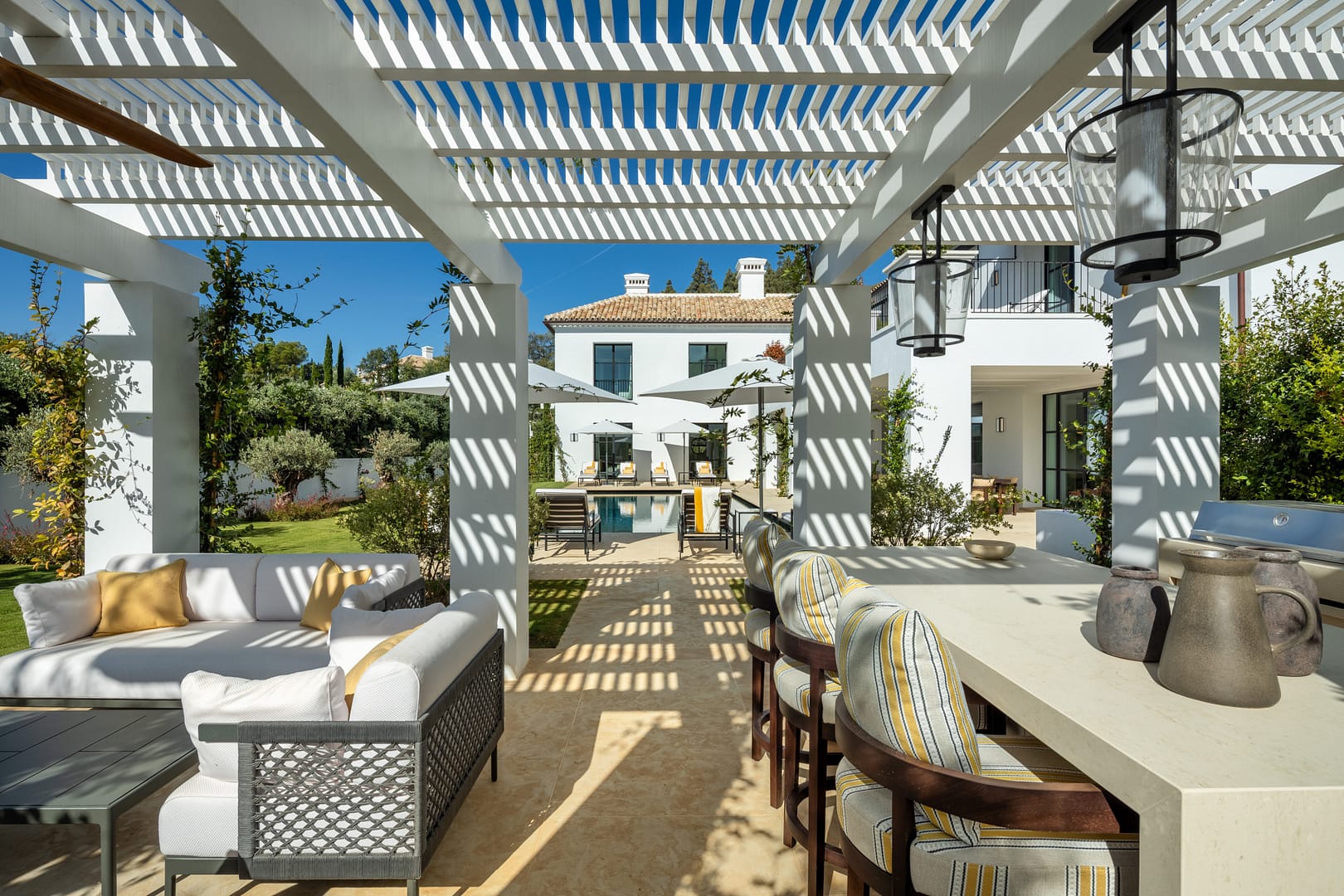 Adéntrate en la opulencia y la grandeza de esta imponente propiedad que te envuelve en un paraíso celestial en el corazón de Cascada de Camoján. Su arquitectura extraordinaria y diseño único la convierten en una residencia verdaderamente singular, capaz de impresionar desde el primer instante. Obra del reconocido arquitecto responsable de Finca Cortesín, la fachada ha sido pintada en una paleta de tonos nude que transmite paz y serenidad, generando una atmósfera de calma y bienestar para sus residentes. El jardín, en perfecta armonía con la zona verde adyacente, es un oasis cautivador, ideal para organizar reuniones y disfrutar de los 320 días de sol que ofrece Marbella cada año. Flores trepadoras decoran las paredes exteriores, aportando estallidos de color y belleza que integran el entorno natural con elegancia y sutileza. La elegancia atemporal se refleja en cada espacio interior, con mobiliario a medida y una decoración refinada. Las terrazas superiores permiten una conexión fluida entre interior y exterior, mientras que los amplios ventanales inundan la vivienda de luz natural, acentuando su carácter luminoso, acogedor y sofisticado.